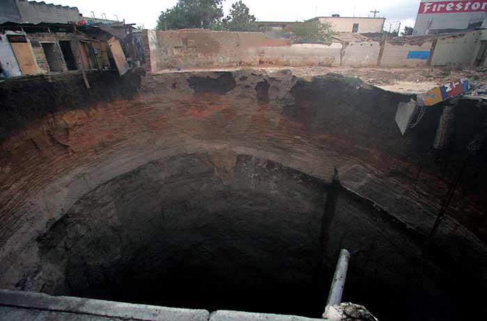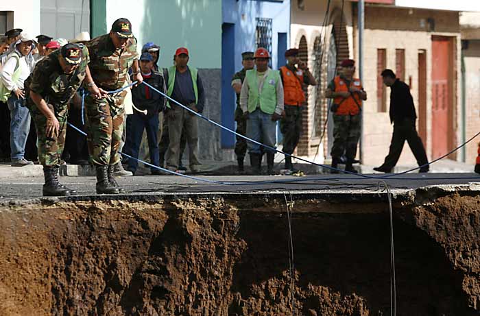 GUATEMALA CITY, Guatemala - A 330-foot-deep sinkhole killed at least two teenagers as it swallowed about a dozen homes early Friday and forced the evacuation of nearly 1,000 people in a crowded Guatemala City neighborhood. Officials blamed the sinkhole on recent rains and an underground sewage flow from a ruptured main.